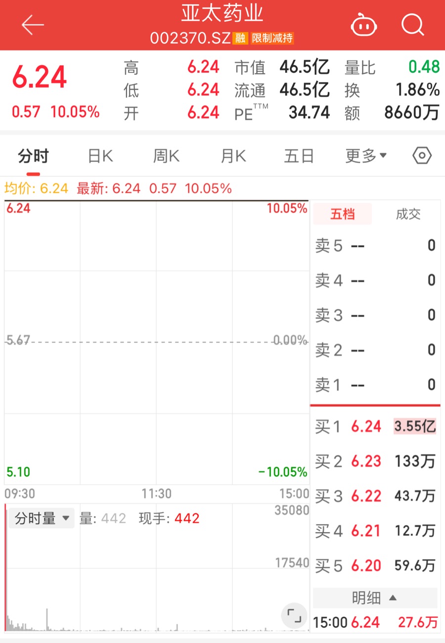 10月14日,深陷亏损泥潭的老牌药企亚太药业(002370)(002370.SZ)开盘即封涨停,截至收盘,报6.24元/股,封板金额达3.55亿元。